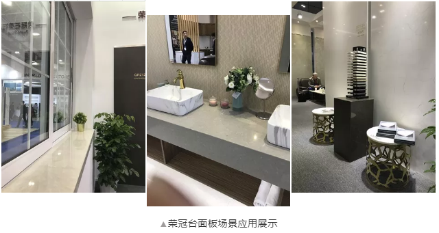 本次榮冠石材展位(C5023)以白色調(diào)為主,香檳金色為輔,通過簡(jiǎn)約的空間演繹時(shí)尚典雅的視覺效果,凸顯出榮冠石材 “人造石工程專業(yè)服務(wù)商”以及“專業(yè)定制出口臺(tái)面板”的定位。