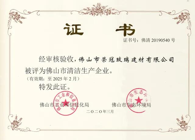 日前,佛山市工業和信息化局、佛山市生態環境局發布了《第二十二批佛山市清潔生產企業名單 》,經審核驗收,佛山市榮冠玻璃建材有限公司獲評“佛山市清潔生產企業”。